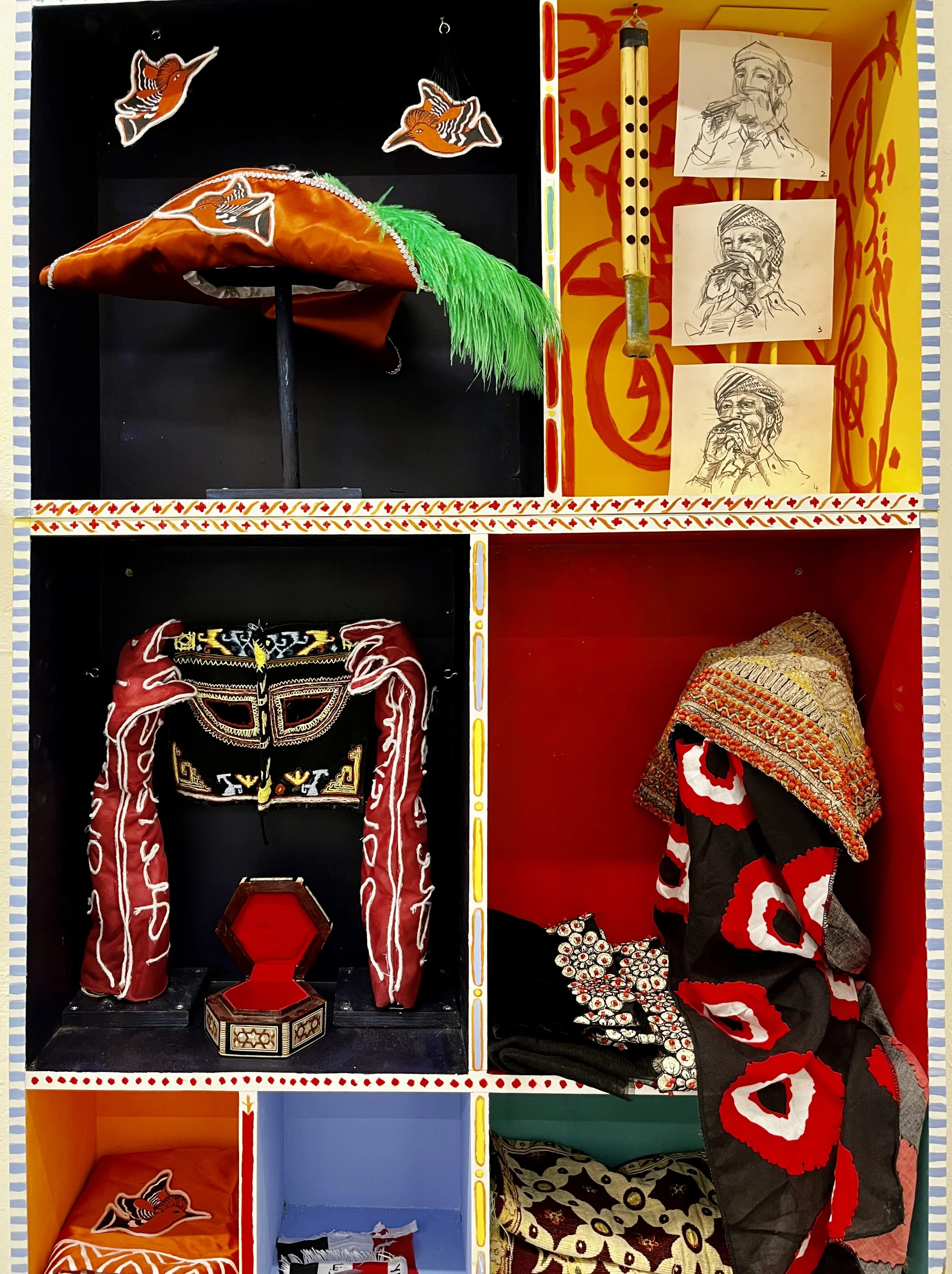 The Al- Tariq Cabinet: Al-Tariq (meaning ‘The Way’/ ‘The Path’ in Arabic) is a cabinet that establishes a language between childhood memories and the absence within archives by merging fictional and historical narratives to reflect how culture is constantly changing. It is named after a newspaper agency founded by my grandfather as a journalist. Reflecting the multi-faceted pathways from which cultures emerge and playful forms, it juxtaposes scenes of traditional garments, jewellery, and archives with archival map drawings of imports in Aden, Yemen, alongside fabricated fictional headpieces and pop-culture references, including The Beatles’ album and altered Sgt Pepper’s suits on display. It revives a playfulness in how heritage is encountered in the echoes of history and the obsessions of the personal.